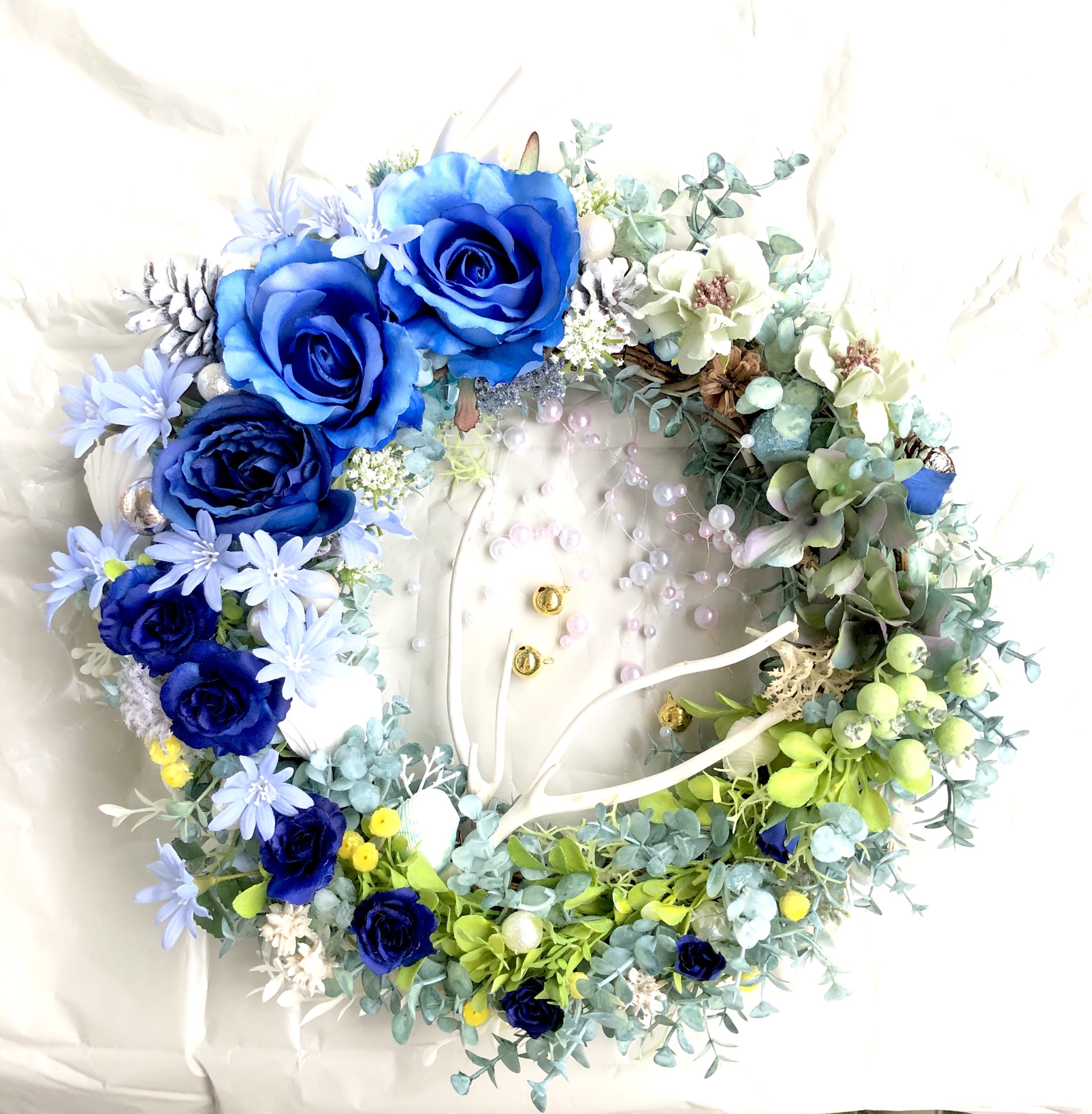 青いバラの花ことばが「夢かなう」なので、青いバラを使ったリースにしようと決めました。